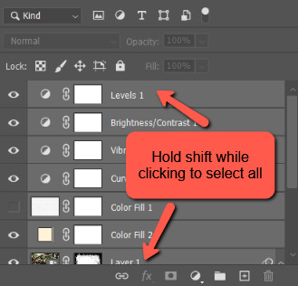 To merge layers, choose all of the layers by clicking on the primary layer, holding the Shift key, and clicking on the final layer.