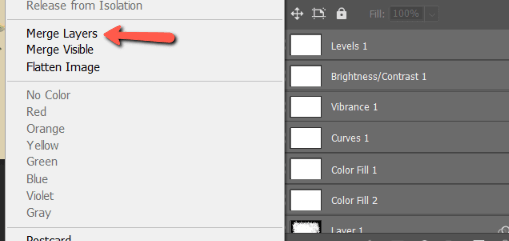 Now right-click on the layers. Choose Merge Layers from the menu that seems. Discover that the Flatten Picture command is accessible right here as effectively. Each instructions can be found in each places.