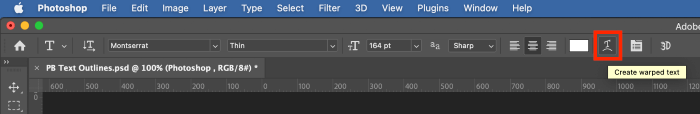First, switch to the Text tool and add some text. When you’re happy with the content, locate the Create warped text button in the options panel above the main image window (see highlighted area in the screenshot below).