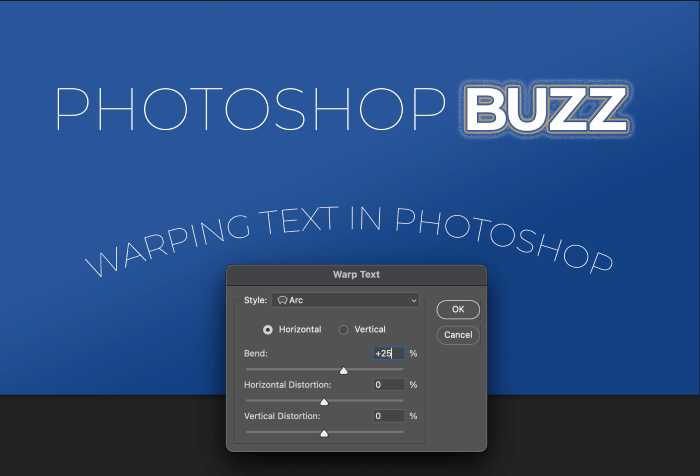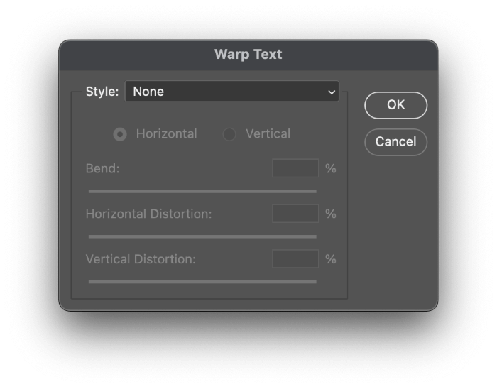 Click the icon and Photoshop will open the Warp Text dialog box. In the Style dropdown menu, you’ll find a wide range of preset warps that can help you create curved text.