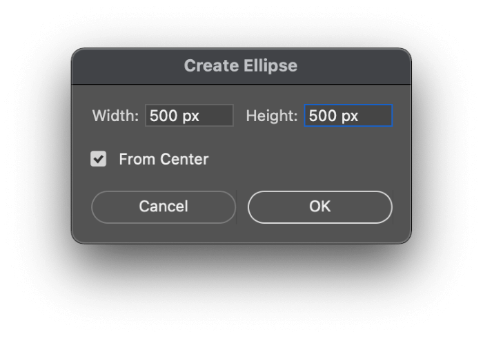 The Ellipse tool can be used in two ways: you can click and drag anywhere in your document to create your ellipse visually, or you can click once anywhere in the document to set the size of your ellipse using pixel values. Setting equal values for height and width will create a perfectly circular path.