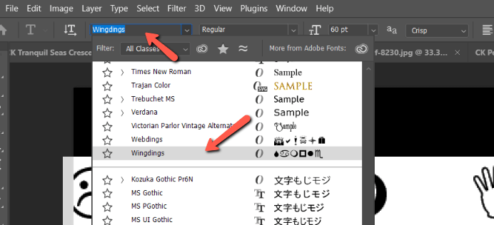 Then go to the Options bar and click on the font box. This will open a list of available fonts. Scroll down to the bottom and choose Wingdings.