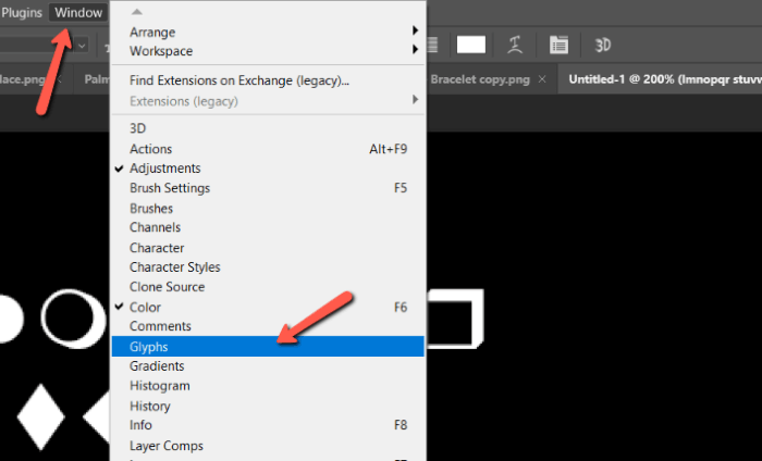 To access it, activate the Glyphs menu through the Window option in the menu bar. Click on Glyphs to make the panel appear.