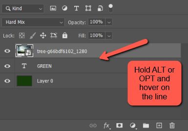 Another alternative is to hold down the ALT or Option key and hover the mouse over the line between the layers you want to connect. The cursor will turn into a little box with the 90-degree arrow pointing down. Left-click to apply the mask.