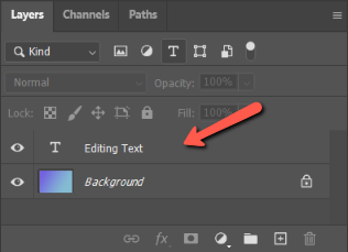 To edit text you need to tell Photoshop what you want to change. In my example, finding the text layer is simple because there are only two layers in my project.