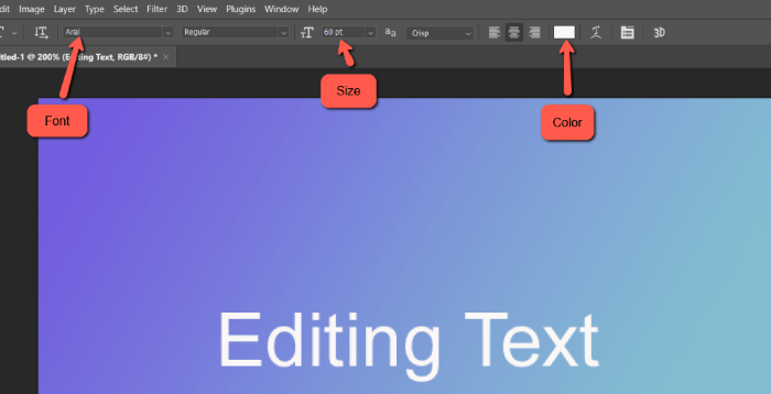 With the text layer selected, it won’t be obvious that you can make changes. However, you can change the font, color, size, etc using the Options bar.