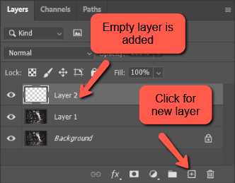 We want to add the clouds on their own layer so click the New Layer icon at the bottom of the Layers panel. Alternatively, you can press Shift + Ctrl + N or Shift + Cmd + N.