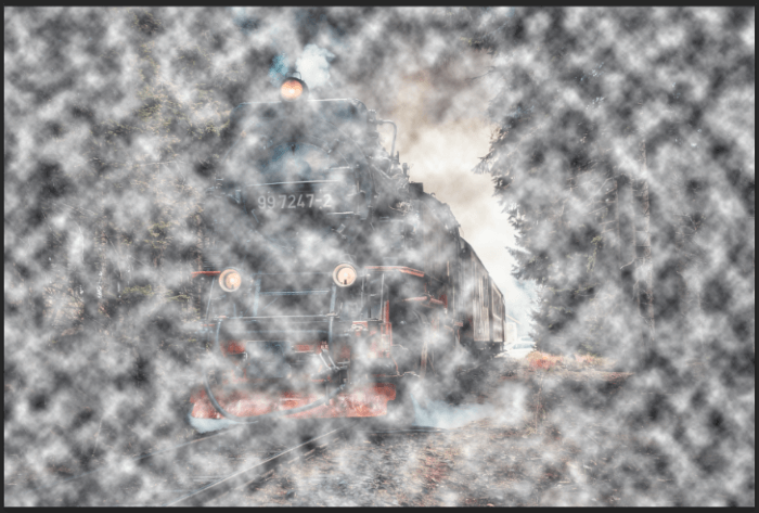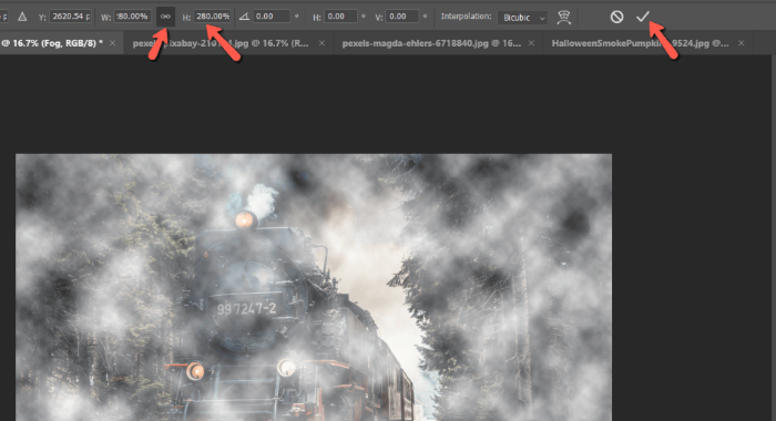 Okay, it’s pretty foggy, but it doesn’t look natural at all! We need to get a smoother look by enlarging the cloudy overlay. With the fog layer selected, press Ctrl + T or Command + T on the keyboard to open the Transform tool.