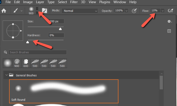 Choose a Soft Round brush. Make sure the Hardness is set to zero. Turn down the Flow to 10% or even lower to very slowly remove the effect. We don’t want any hard lines anywhere.