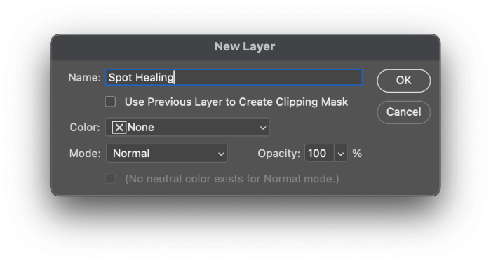 Give your layer a descriptive name and click OK. You might be tempted to skip this, but it’s a good habit to learn at the beginning. It’s all too easy to find yourself with 20 different layers named New Layer and no idea which layer controls which image element. Name your layers!