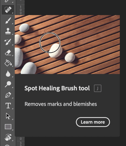 Next, switch to the Spot Healing Brush tool using the toolbox icon shown below or the keyboard shortcut J.