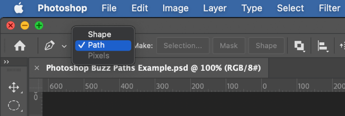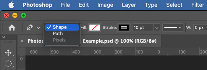In the Options bar above the main document window, open the path type dropdown menu (shown below) and select the Shape option.