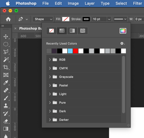 Simply click each swatch to open a menu offering a range of preset color choices, including your most recently used colors. To use the traditional color picker dialog, simply click the color picker icon in the swatches menu (shown below).