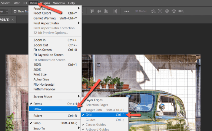 If you can’t remember the shortcut, go to View and hover over Show. You can turn the grid on or off from here. Plus, the shortcut is listed to refresh your memory.