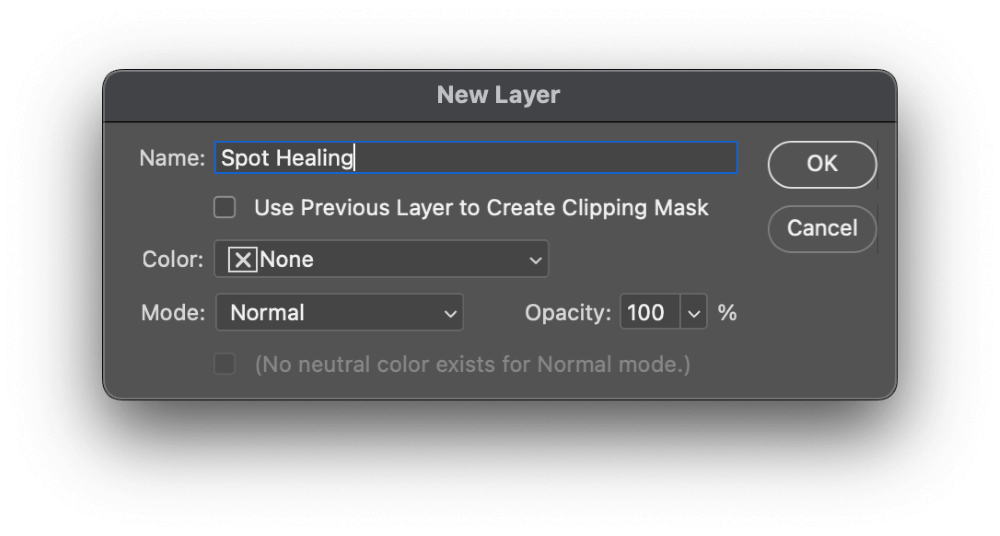 Create a brand new layer to carry all of your spot therapeutic pixels by urgent the keyboard shortcut Command + Shift + N (use Ctrl + Shift + N when you’re utilizing Photoshop on a PC). Give your new layer a descriptive title and click on OK.