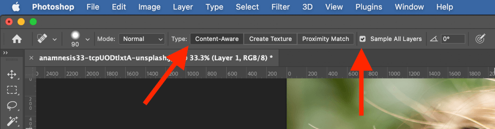 Change to the Spot Therapeutic brush utilizing the toolbox or the keyboard shortcut J. Within the device choices bar on the prime of the principle doc window, guarantee that the Sort setting is Content material-Conscious, and that the Pattern All Layers field is checked.