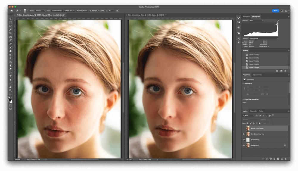 It’s additionally attainable to clean pores and skin manually in Photoshop, however it is a lengthy and sophisticated course of that makes use of some unusual Photoshop methods like high-pass filters and mixing modes – and I’m not satisfied that it does a greater job than Neural Filters.