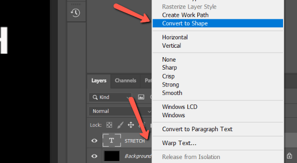 Proper-click on the textual content layer and select Convert to Form. Be sure you have your textual content positioned and sized appropriately earlier than doing this. It turns into harder to reposition and resize the letters as a complete after this.